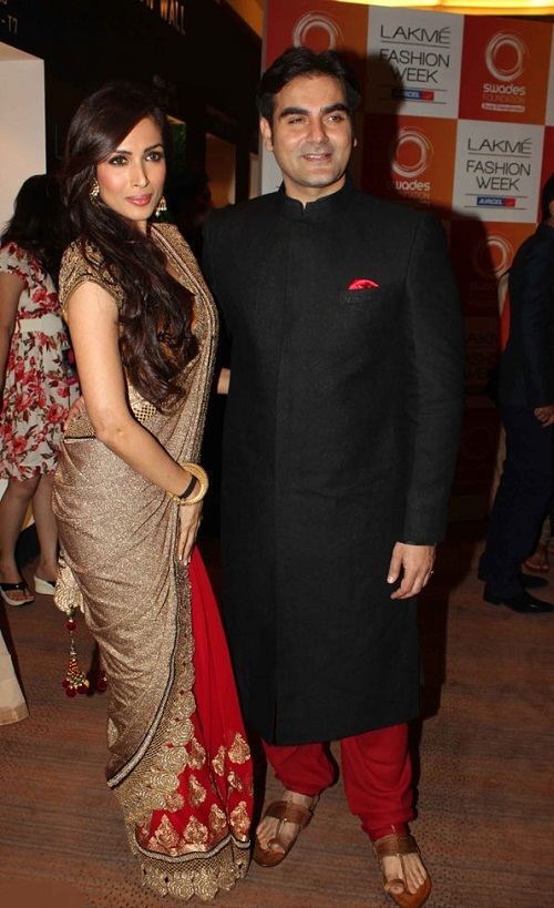 Malaika Arora Khan in beautiful gold and red designer half and half saree. Designed by  Vikram Phadnis at Day 4 LFW Summer/Resort 2013. Gold embellished patch  work designs around the border.  Silver embroidered work around the  border. Paired with black designer embroidered cap sleeves saree blouse.  Gold embellished patch work designs all over blouse.