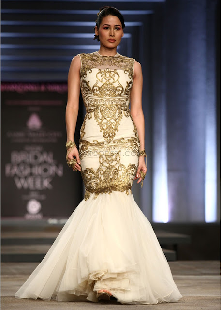 Gold featured strongly in the new collection with a smaller focus on white, red and earth tones. The outfits consisted of evening gowns with mermaid skirts, luxurious lehenga-cholis with modern lines and anarkalis that you had no choice but to fall in love with on sight.